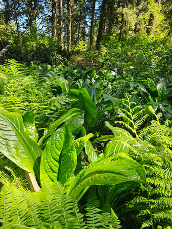 The Rainforest at the Prehistoric Gardens is rich in biodiversity, supporting a vast ecosystem of old-growth trees, lush ferns, hanging moss and a wide variety of woodland creatures. Ferns grow to gigantic size, trees live for hundreds of years and even the common skunk cabbage develops huge tropical leaves. Known as a temperate zone rainforest, this primeval garden developed because of its location; nestled in a valley pocket and therefore protected from the fierce winter storms that sweep the Pacific.